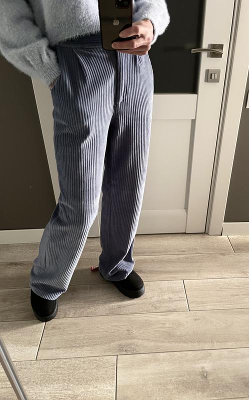 Брюки у рубчик, затишні та мʼякі але гарно тримають форму, пильно небесного кольору, позаду на резинці, що дає змогу одягати як на S розмір так і на М тримають форму, одягалися один раз