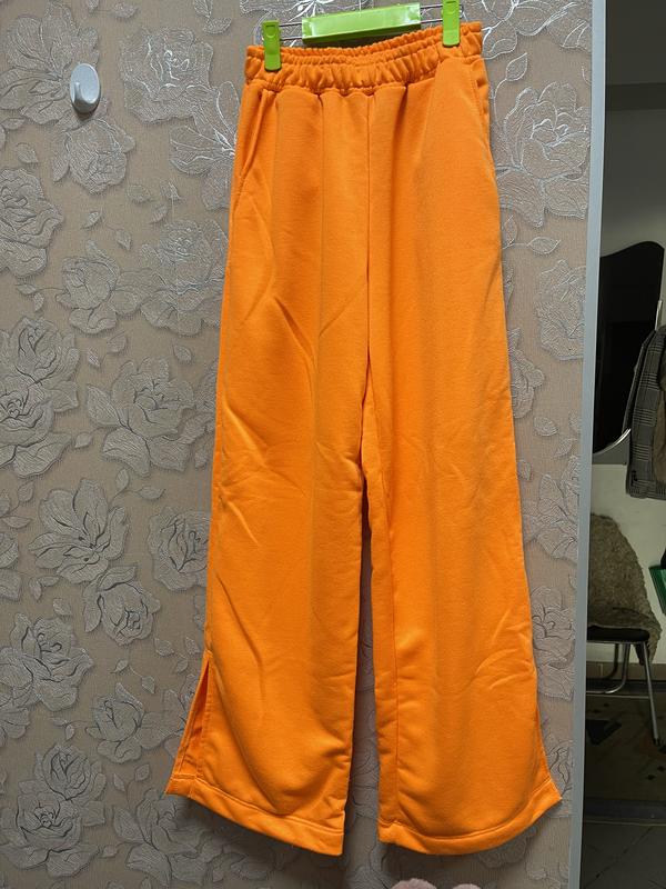 Яркие брюки расширены к низу,меют распорки по бокам внизу,двухнутка,пояс резинка,два кишени