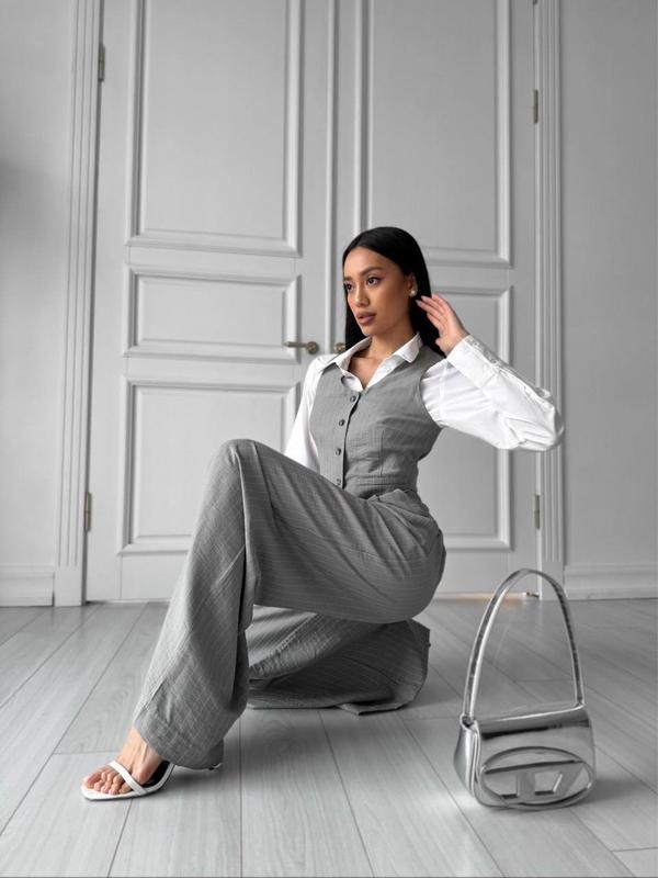 💙Брюки-палаццо Іспаніо 💛ціна 1360грн Тканина: «Rayon смуга» Склад: 92% віскоза 8% поліестер, Колір: чорний та сірий (тонка смужка як на фото) Розмір: XS, S, M, L, XL Параметри моделі на фото: Зріст: 170 см, ОГ: 86 см, ОТ: 64 см, ОС: 93 см. На фото представлена модель розмір S (42/44). Комплектація: брюки Фактичні виміри виробу: Об'єм по талії (брюки): XS – 56/62; S-60/66; M-64/70; L-68/74; XL-72/78; Об'єм по стегнам (брюки): XS -96; S-100; M-104; XL-108; XL-112; Об'єм штанини зверху: XS -72,5; S-74; M-78; L-82; XL-86; Довжина виробу з боку: XS -116.5; S-117; M-117,5; L-118; XL-118,5; Довжина виробу за кроковим швом: XS -85.5; S-85; M-84,5; L-84; XL-83,5;