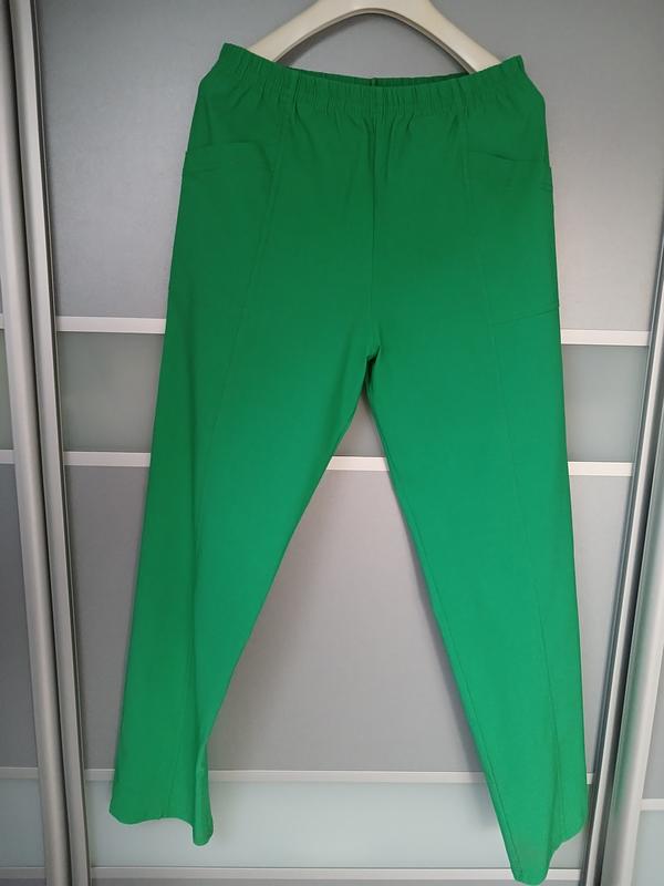 Брюки яркого зеленого цвета р.38, на резинке с карманами, высокая посалка. Очень в хорошем состоянии. Замеры: пояс 35-45, поб 46, длина 98, ширина 17см, посадка 31/34.