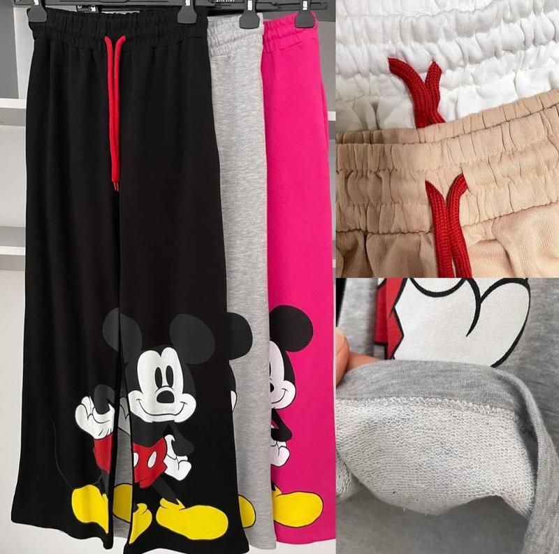Круті штани палаццо з Міккі. Тканина тягнеться. Якість відмінна. Виробник: Туреччина. Тканина: трикотаж 3-х нитка. Кольори: чорний: С, М, Л. Малиновий: С, М, Л. Сірий: С, М. Беж: С, М, Л. Молочний: М, Л. С: ПОБ 45, довжина 104 М: ПОБ 48, довжина 105 Л: ПОБ 51, довжина 107см