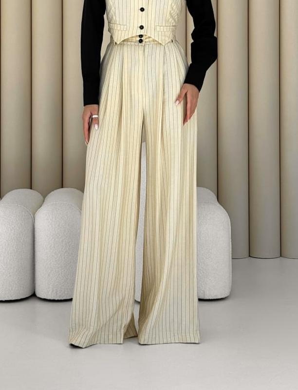 Трендовая новинка🔝 Классические брюки-палаццо ✔Крой прямой ✔Силуэт: прямые палаццо со складами по талии ✔Модель с фиксированными складками по переду. ✔Брюки с комфортной посадкой. ✔Посадка: высокая ✔Модель дополнена удобными боковыми карманами. ✔Карманы: в швах, с косым входом ✔По спинке на талии – резинка, ширина шлиц – 6 см. ✔Пояс: приточный с резинкой по спинке и шлевкам ✔Застежка: гульфик на молнии и пуговица на поясе. ✅ Комплектация: брюки-палаццо ✅ Материал: район полоса ✅Состав материала: 92% вискоза 8% полиэстер, Color в тонкую полоску: Серый, Черный 📐Size: XS, S, M, L, XL 🔻Замеры сделаны по готовому изделию: Объем по талии (брюки): XS – 56/62; S-60/66; M-64/70; L-68/74; XL-72/78 Объем по бедрам (брюки): XS-96; S-100; M-104; XL-108; XL-112 Объем штанины сверху: XS –72,5; S-74; M-78; L-82; XL-86 Длина изделия со стороны: XS-116.5; S-117; M-117,5; L-118; XL-118,5 Длина изделия по шаговому шву: XS -85.5; S-85; M-84,5; L-84; XL-83,5 *Параметры модели на фото: 86-64-93. Рост 170см. На модели размер S (42/44) ✅Производитель оставляет за собой право на смену фурнитуры на подобную. ✅ К заказу брюки-палаццо доступны в комплекте с жилеткой - стоимость и дополнительную информацию , пожалуйста, уточняйте у нашего менеджере. . 🎥Видеообзор -доступен при открытии ссылки в web browser ( Safari, Google Chrome, Firefox, Edge, Opera или др) **В зависимости от цветопередачи Вашего монитора, оттенок изделия может немного отличаться Мы прежде всего за качество, поэтому в производстве обращаем внимание даже на мелочи. Именно поэтому, наши изделия можно носить не один сезон. 💎 Ткань Premium качества 💎 Материал протестирован на прочность, износостойкость . 💎 Дорогая фурнитура. 💎 Пошив на оборудовании из Германии и Японии по современным лекалам. 💎 Фабричное производство, официальная торговая марка. 💎 Возврат / Обмен согласно Закону Украины "О защите прав потребителя" 💎 Наложенный платеж с предоплатой по Новой Почте на коллекции в наличии