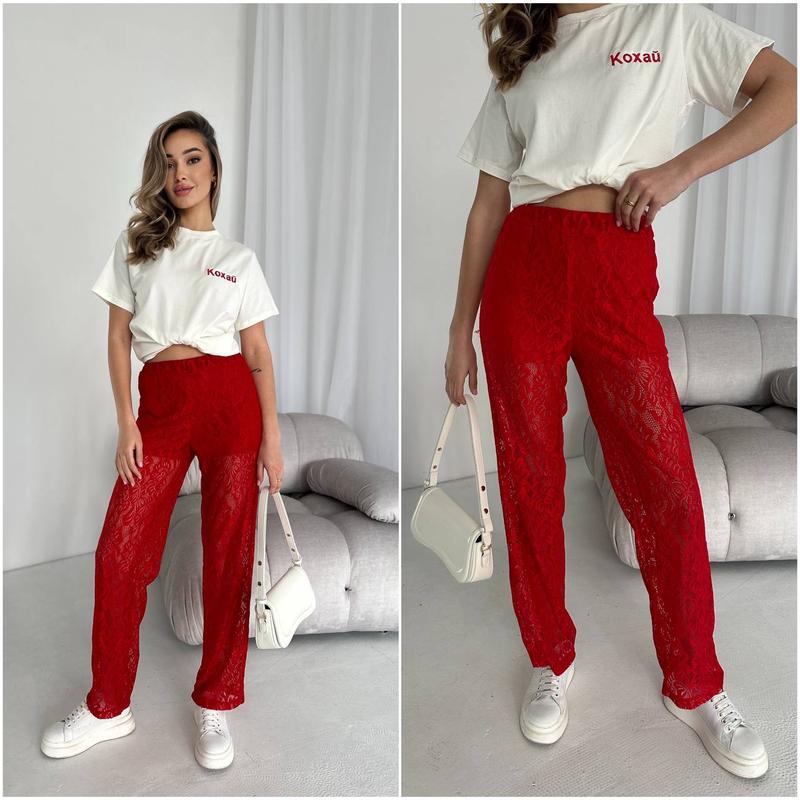 🆕Штани 🆕В наличии в большом количестве ▪️Модель : 0114 ▪️Размер : 42-44 ; 46-48 ▪️Цвет: Красный, Черный, Белый ▪️Ткань : Кружево на хлопке Фото реал Брюки в стилистике GIRLY MOOD (девческий стиль), как с Pinterest лично актуальны. Брюки свободного, прямого кроя на резинке, с карманами. Подкладка - короткие трикотажные шортики пришиты к основной ткани. Легко стилизуется как с оверсайз футболками, худи, джемпером - на каждый день, так и с корсетом, для особых случаев.