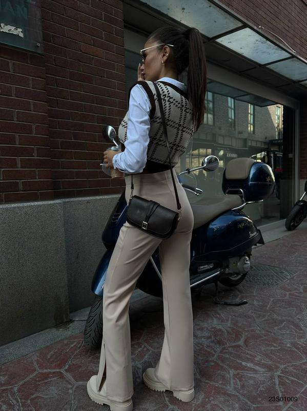 Штани актуального крою з розрізом на зовнішній стороні штанини. Колір : беж Розмір: s,m,l Ціна: 610грн