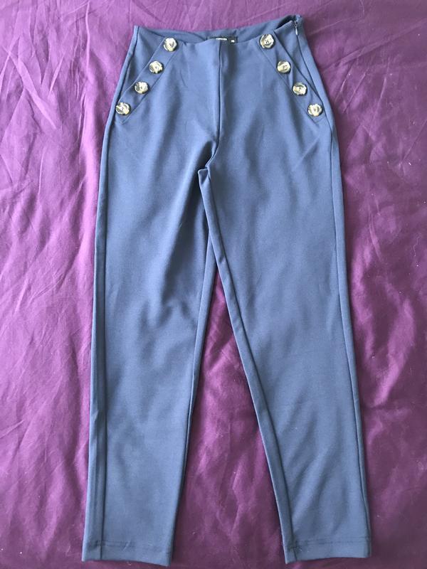 Абсолютно нові штани, жодного разу не надягали і не носилися! Довжина -94 см ПОТ - 32,5 ПОБ - 45 см Завужені до низу. У самому низу ПО - 14 см вказаний розмір XS, але йдуть на S-M. Застібаються на блискавку збоку. По боках декоративні кишені. Склад: 95% поліестер, 5% еластин