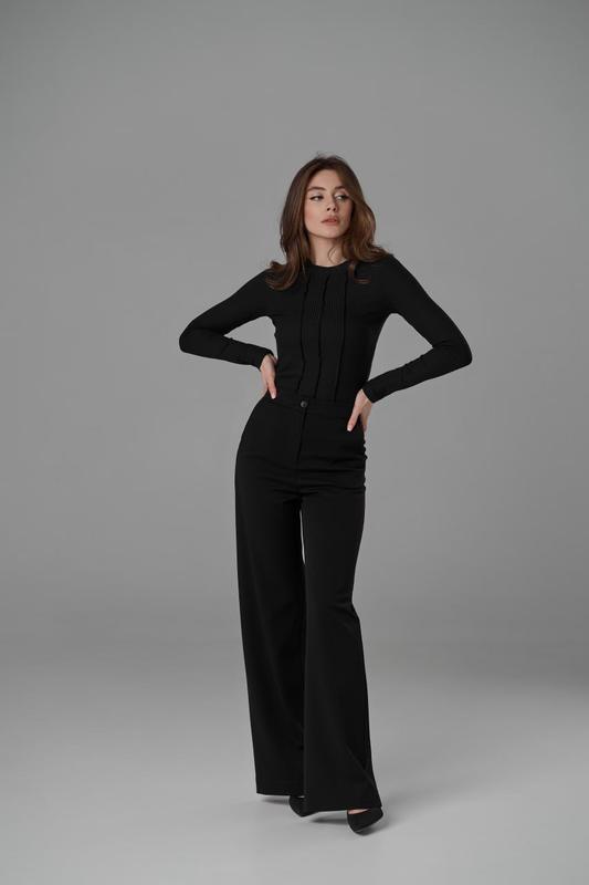 Брюки палаццо свободного кроя, расширенные от линии бедра, длинные из однотонной костюмной ткани Тиар средней плотности черного цвета. Украинский производитель Размер ХС (на рост до 165см) Замеры на фото Состояние новое (срезанная бирка) Старая цена 1285 грн -ворота за 1099