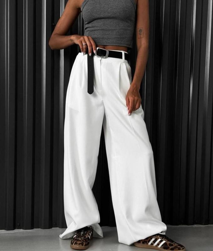 Брюки палаццо, высокая посадка, с карманами. Длина брюк 110 см. Тканина: костюмка. Цвет: молоко. Размеры: SM / ML Талия: 60-66см <unk> 65-73 см Стегна : 88-94 см | 95-99 см