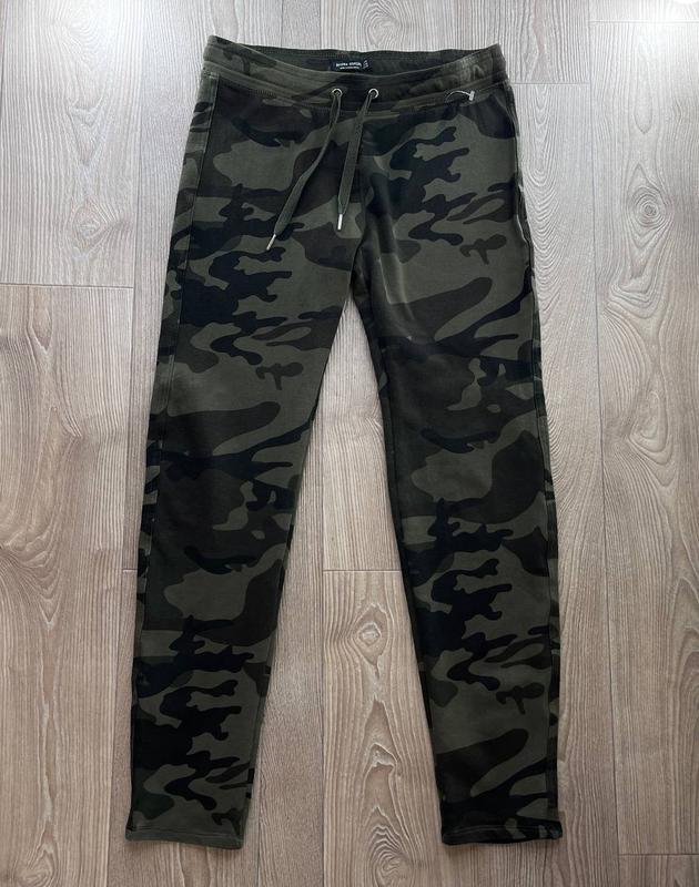 Брюки цвета хаки (камуфляж) из двунитки BERSHKA🛍❤️🔥 Размер - UK 10-12/EUR 38-40/ M-L/ 46-48. Состав: 80% хлопок, 20% полиэстер. Производитель Бангладеш. Брюки из эластичного трикотажа (дворитки) камуфляжного цвета. Облегающего кроя с широкой резинкой пояса, есть внешняя кулиска. Хорошо тянутся. Дополнительные замеры: полная длина 95 см (из них высота резинки 5 см), шаговая длина (по внутренней стороне ноги) 71 см, полуобхват пояса 38 см (полный охват 76 см) и тянется до 95 см, полуобхват бедер 48 см (полный обхват 96 см) и тянется до 120 см, полуобхват ноги вверху 27 см (полный охват 54 см) и тянется до 65 см, полуобхват ноги внизу 14 см (полный охват 28) и тянется до 40 см, посадка по линии переда 24 см, посадка сзади 30 см.