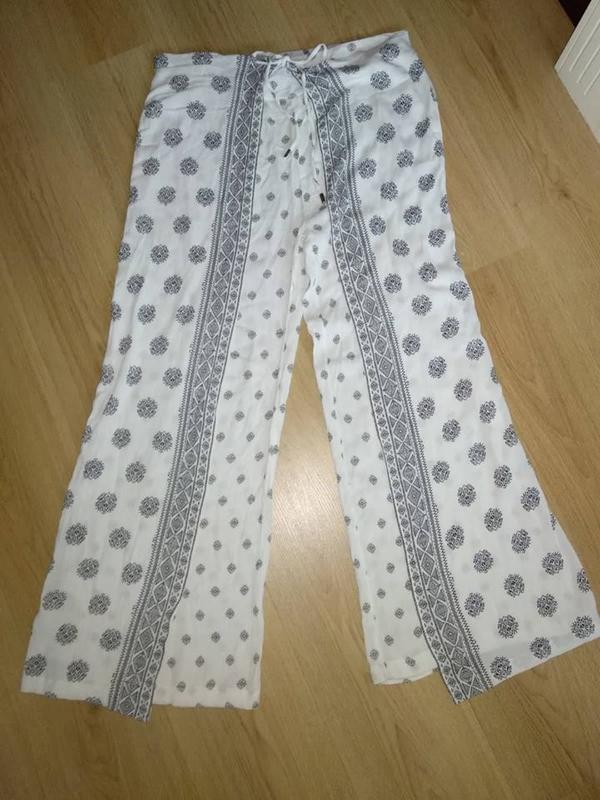 Брюки пляжные Atmosphere,индия,отличное качество,оригинальный фасон -спереди выглядят как юбка-брюки,задняя часть поясас на резинке ,размер 48-50,замеры:длина по боковому шву 102 см,ширина низа штанины 33 см,ПОГ 41 см,ПОБ 60 см.