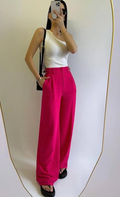 Штани Модель 387 Цена1000грн Размер 42/44 46/48 Модель 1387 Цена1000грн Размер 50/52 54/56 Ткань жатый лен ( состав лен, полиэстер и эластан), за всем немного тянется Стильные брюки на высокой посадке с широким поясом, который моделирует вашу фигуру и делает талию более выразительной Боковые карманы, шлевки под пояс, застежка молния и пуговица Цвета-малина, черный, молоко и голубой