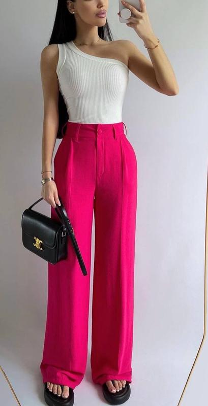 Штани Модель 387 Цена1000грн Размер 42/44 46/48 Модель 1387 Цена1000грн Размер 50/52 54/56 Ткань жатый лен ( состав лен, полиэстер и эластан), за всем немного тянется Стильные брюки на высокой посадке с широким поясом, который моделирует вашу фигуру и делает талию более выразительной Боковые карманы, шлевки под пояс, застежка молния и пуговица Цвета-малина, черный, молоко и голубой