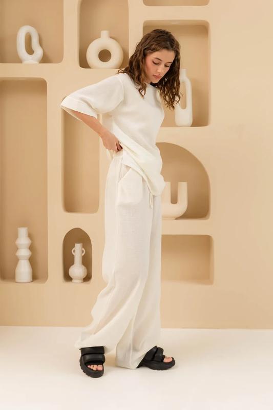 Матеріал льон-жатка Колір білий Фурнітура резинка Фасон прямий, вільний Сезон літо Конструктивні елементи кишені збоку Комплектація штани Догляд за одягом ручне прання до 30° Довжина брюк S-M = 107 см, L-XL = 108 см, XXL-3XL = 109 см Замовлення можна оформити через Вайбер Дивіться також: Блузки, топи, футболки Жилетки, піджаки, кардигани Жіночі брюки Костюми жіночі Весь каталог якісного жіночого одягу