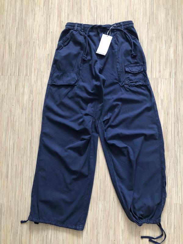 Новые (с этикеткой) мешковатые брюки / baggy приятного припыленного темно-синего цвета (такой себе сине-серый)). Ткань натуральная, приятная к телу, в составе 55% хлопок, 45% вискоза. Комфортная высокая посадка. Застёгиваются на молнию впереди. В пояс фрагментарно (по бокам и сзади) вставлена резинка для лучшей посадки. В поясе есть кулиска (тоннель), в которую продернут шнур точно в цвет основной ткани (можно уменьшить объём талии) Впереди два накладных объёмных кармана с диагональным входом, на левом кармане сверху расположился еще один маленький накладной кармашек под клапаном. Сзади два накладных кармана. По внутреннему шву в районе колена заложены защипы. Штанины достаточно широкие, по краю штанин кулиска, в которую продернуты плоские шнуры, которыми можно регулировать ширину края. На фото 1 показала и такой, и такой вариант. На фото 2,4 край в свободном состоянии, на фото 3,5 с затянутым шнурком. В обоих случаях смотрится стильно, модно, молодежно)) Замеры в не растянутом виде, см: ПОТ (по поясу) 37, тянется до 46, можно уменьшить шнуром, ПОБ 62, длина внешнего шва 106, длина шагового шва 82, посадка 29/ 37, 1/2 ширины штанины в верху 35, 1/2 ширины штанины в районе колена 31, 1/2 ширины штанины по краю 30. Отправляю Новой почтой либо наложенным платежом (при условии оплаты доставки в оба конца), либо по предоплате на карту Приват, Укрпочтой по предоплате, Meest по предоплате Продаю много фирменных вещей Airfield, Strenesse, Gerry Weber, Steilmann, Brax, Bonita, Basler, Frank Walder, Apanage, Olsen, Ulla Popken, Gardeur, Monari, Rabe, Guess, Hauber, Marks&Spencer, Concept K. Много новых вещей (с этикеткой) - можно на подарок. Смотрите другие мои объявления. Спасибо, что заглянули :-)