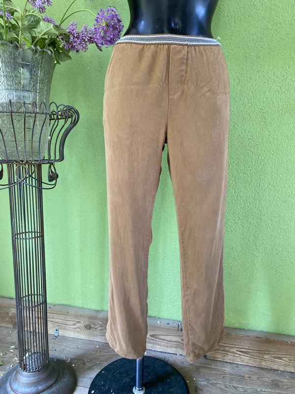 Легкие удобные качественные брюки от Chloe Stora. Цвет: светло-коричневый/рыжий, по талии-цветная резинка, два кармана. Состав:коттон-100/. Размер по набору-40. Замеры: длина по внешнему боковому шву-90 см, по внутреннему-70 см, ПОТ-40 см, ПОБ-49 см, полуширина штанины по низу-17 см.