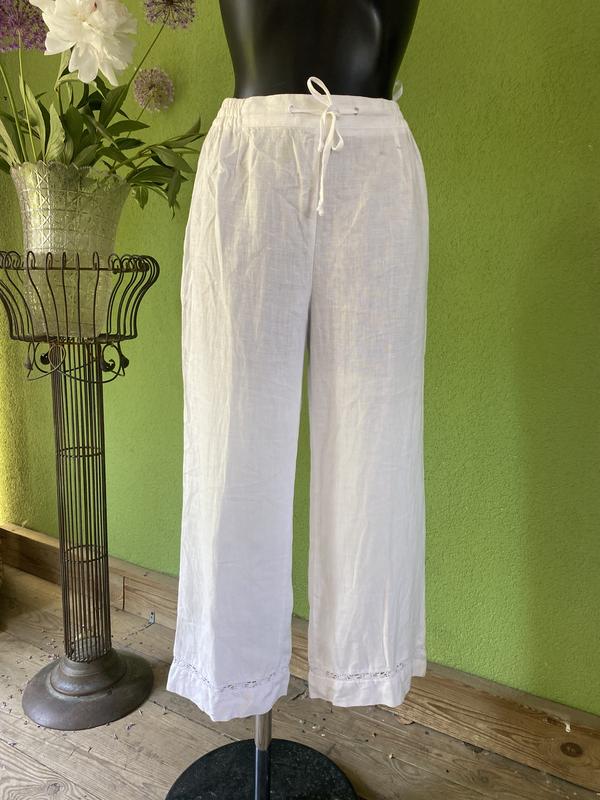 Стильні якісні актуальні білі брючки від Franco Callegari. Склад:льон-100/. Декор по низу-тесьма. По талії широка гумка з кулискою. Розмір по бірці-10. Заміри:довжина по зовнішньому боковому шву-87 см, по внутрішньому-60 см, ПОТ-34 см(гумка в нерозтягнутому стані), ПОБ-45 см, напівширина штанини по низу-24 см.