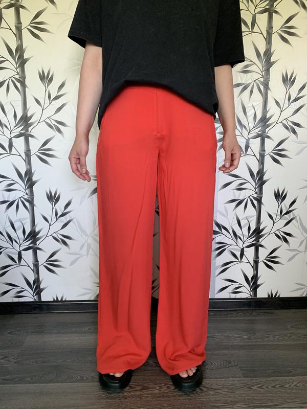 Брюки помаранчевого кольору, вільного крою На розмір Л У складі 100% віскоза( дуже приємні до тіла, легенькі) Довжина 111 см, напівобхват талії 41 см, напівобхват стегон 56 см, посадка попереду 28 см Стан ідеальний