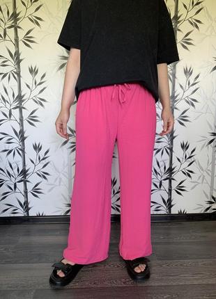 Штани вільного крою, рожевого кольору У складі 35% віскоза, 60% поліестер Довжина 95 см, напівобхват талії 36 см( на резинці, добре тягнеться), напівобхват стегон 62 см, посадка попереду 32 см Стан ідеальний