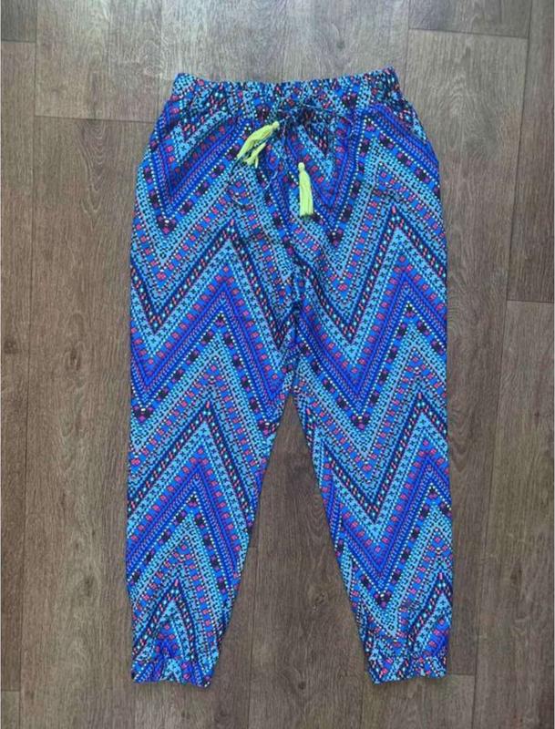 Брюки, размер L, внизу резинки, длина с резинками 99 см, полуобхват талии по резинке в спокойном состоянии 37 см, тянуться до 53 см, полуобхват бедер 55 см, есть карманы, выполненные в Индии