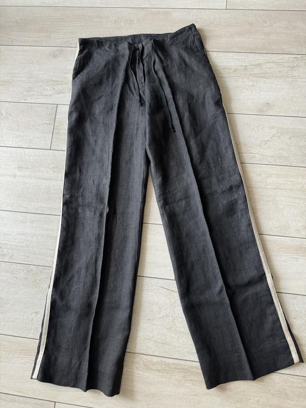 В очень хорошем состоянии Легкие брюки, лён Бирка с составом срезанная Замеры на фото Боковые лампасы бежевого цвета Пояс стягивается счеуровктю