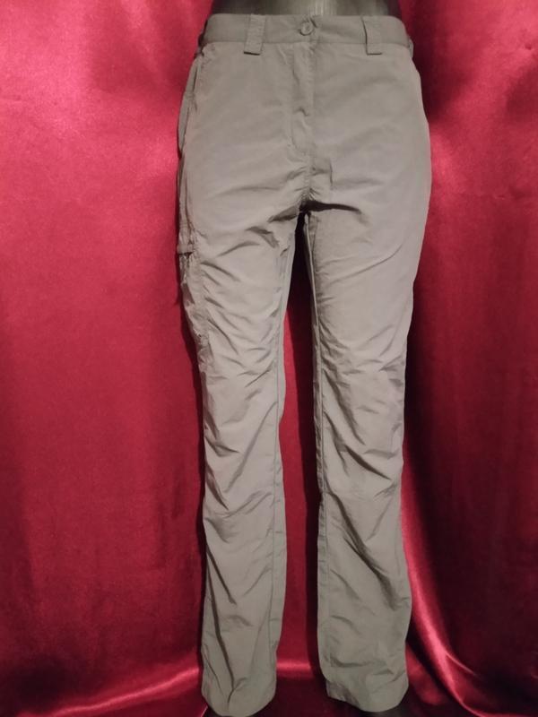 Размер указан 10 (М) и 31 (L), так что лучше ориентироваться по замерам: Длина: 102 см, Полуобъем талии: 38 и тянется примерно до 42 см, Полуобъем бедер: 51 см, Посадка перед/зад: 25/35 см. Много карманов. Резинка по бокам (последние две фотографии). Цвет насыщен серый (как на фотоках с биркой). Ткань в виде плащевки