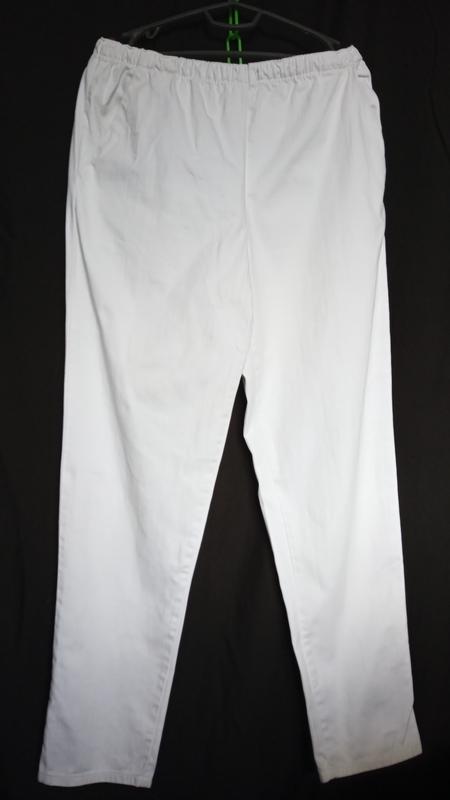 белые, длина108,пояс на резинке, полуобхват пояс в спокойном состоянии40 тянется 50,бедра57-58, крок80,посадка34/40,ширина штанины внизу18