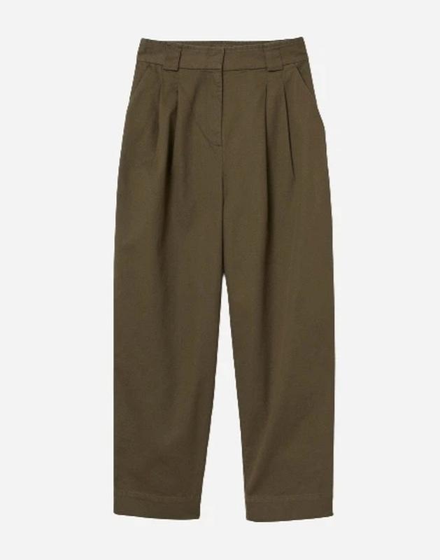 Брюки из плотного коттона темно-оливкового цвета. Укороченные. Фасон - бананы, спереди есть защипы. Штанка к низу чуточку зауженная, но в целом штаны свободного кроя. Талия высокая. Довольно стильные. Бренд - H&M Размер указан - ЕВР 40 / 12 / L ПОТ - 38 ПОБ - 57 Длина - 97 / 64 Посадка - 36 / 42 Ширина штанки сверху - 35, снизу - 20,5 Состояние - идеальный