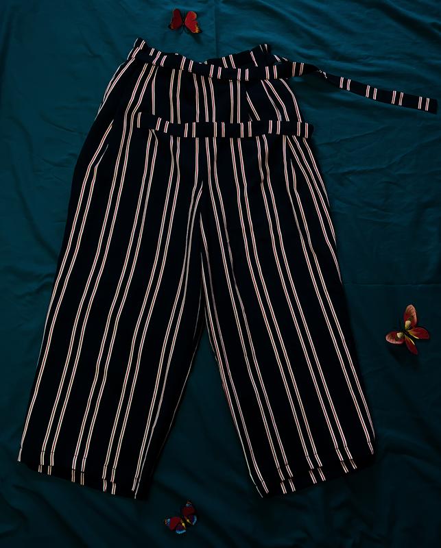 Штани кюлоти, синій колір з рожевими смужками, довжина 85 см, підходить на розмір с,м Тканина не мнеться