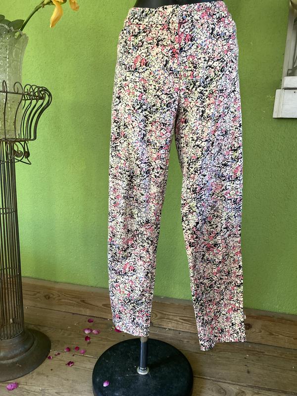 Великолепные легкие брюки с цветочным принтом от Laura Ashley. Состав:котон/эластан(97/3). Размер по набору-10. Замеры:длина по срвному боковому шву-95 см, по внутреннему-71 см, ПОТ-40 см, ПОБ-47 см, полуширина штанины по низу-15 см. Есть нюанс-см. Последнее фото-на внешний вид совсем не влияет(это внутренняя часть задних карманов)