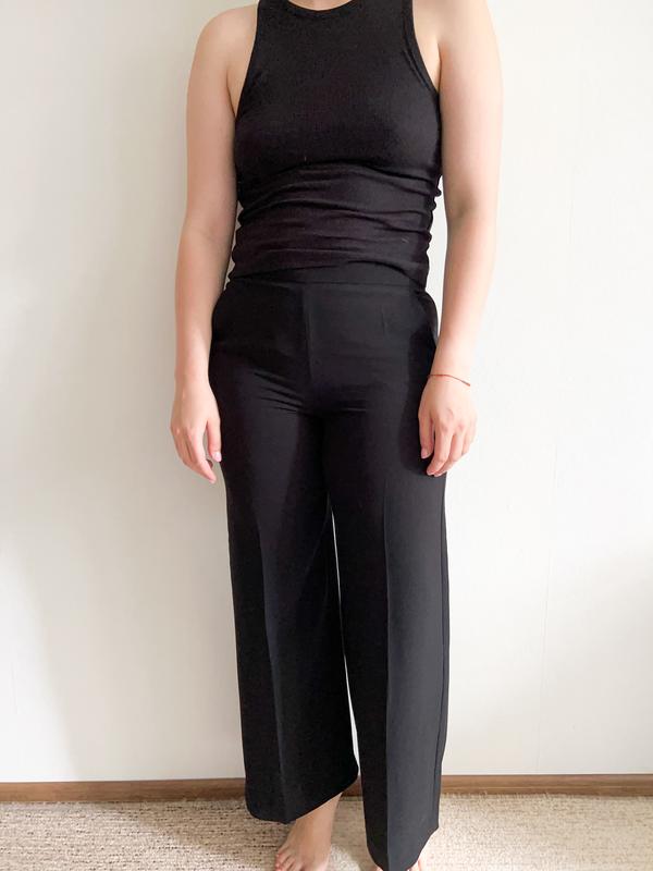 Винтажные брюки прямого кроя, легкий эластичный материал, цвет насыщено черный, посадка средняя, есть карманы, застегиваются на молнию сбоку, нажаль присутствует всего 1 бирка Размер не указан, ориентируйтесь по замерам Длина по внутреннему шву - 102 Длина по внешнему шву - 77 Высота посадки - 29 Пот - 39 Поб - 53
