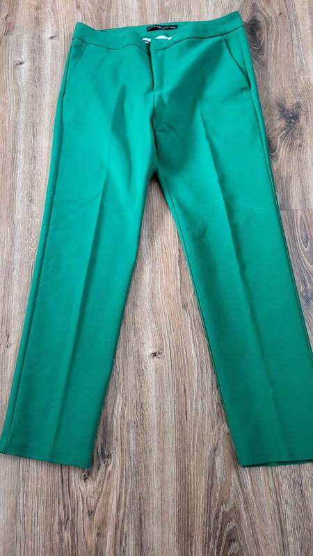 Брюки Karol Basic зі стрілками гарного смарагдового кольoру, розмір М. Довжина -90 см ПОТ -39 ПОБ - 50 Ширина штанини внизу - 16 см Тканина тягнеться Склад: 57 % хлопок 40% полістер 3% еластан Є невеличка непомітна затяжка, див. останнє фото.