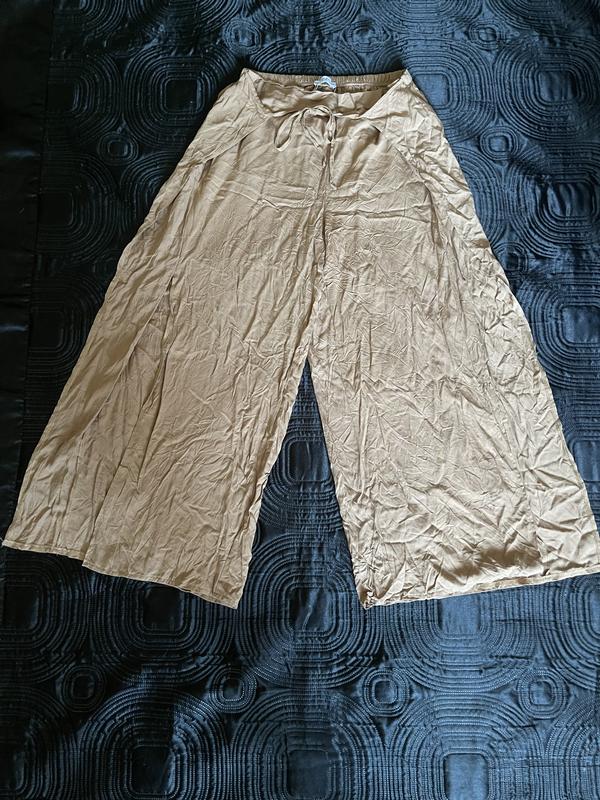 Брюки - палаццо цвета кэмэл. Размер 16/3XL. Пояс 45 см, тянется до 49 см, посадка 34/44 см, длина по боковому шву 104 см, по внутреннему шву 74 см, ширина сверху 39 см, по низу 41 см. Новые, без дефектов, есть запах обработки. Вискоза 95%. Ткань светится.