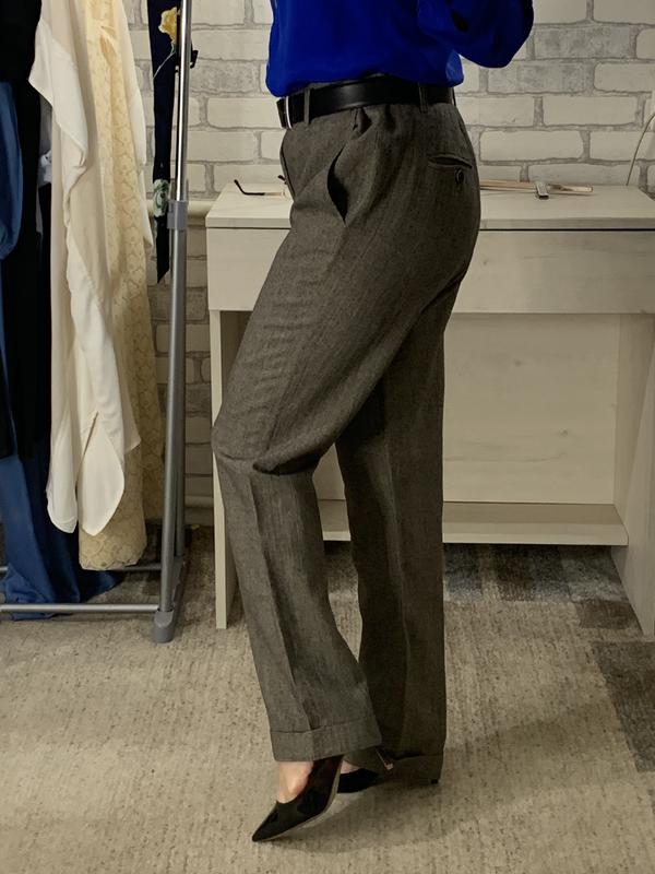 Тепленькие стильные брюки модного кроя на осеннюю пору! Не колючие, приятные к телу! Стан идеален! Состав ткани прекрасный: 59% вовни і 41% рамі! Размер около L-XL, смотрите замеры! По поясу 44, бедра 54, длина 102, шаг 76, посадка 32-29, ширина штанины у промежности 31, ширина внизу 19 см