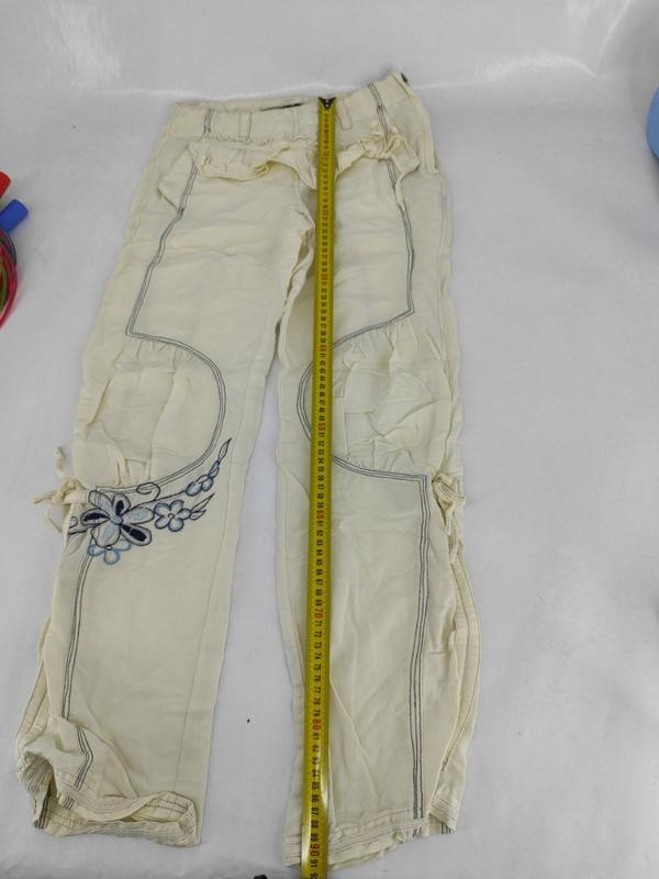 Длина регулируется с помощью завязок. Вышивка на штанине спереди и на поясе сзади. Есть 2 кармана, застегиваются на заклепки. Пояс застегивается на молнию. Натуральная ткань, не парит, приятная к телу.