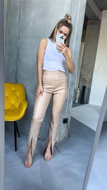 ☁️в наличии☁️ Брюки Арт.0430 Размер: 42, 44, 46 Цена : 1000грн Ткань: эко-кожа Цвет: мокко, хаки Рост 160 см Фото в живую Брюки на высокой,идеальной посадке💣 застегиваются на потайную молнию.