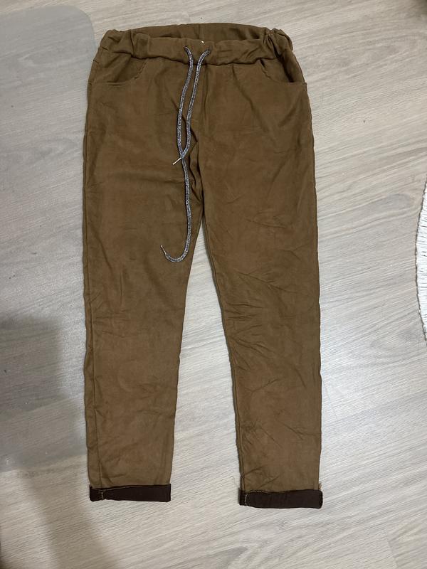Стан идеален, новые без бики, без признаков ношения, без каких-либо нюансов. Ткань очень похожа на замшу, состав 95% полиэстер 5% эластан, поэтому немного тянется. Цвет -молочный шоколад. Замеры - пояс расправлен 50 см, внутри резинка+ шнурок. Бедра 52 см длина по внешнему шву без подворота 96 см по внутреннему 70 см посадка спереди 29 см сзади 36 см ширина штанины по бедру 26 мы внизу 15 см. Фасон вкорочений, до щиколотки. Привезенные на подарок из Италии.Не подходят размер.