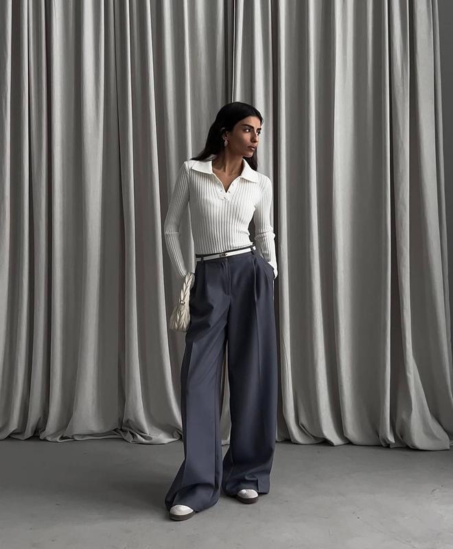 брюки ▪️мод 190 ▪️тканина : костюмка ▪️цвет: графит, черный, беж ▪️СМ; МЛ брюки палаццо; Очень стильные брюки на высокой посадке, клеш от бедра; выполнены из качественной ткани;😍 Длина брюк 110 см Размеры SM <unk> ML Талия: 60-66см <unk> 65-73 см Стегна : 88-94 см | 95-99 см