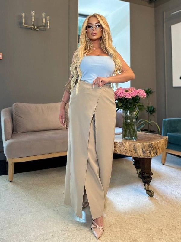 Брюки Колір: чорний, беж. Розмір: 42-44,46-48,50-52 Тканина: костюмна тканина. Талія на резинці. 42-44 Об т - 66+15 см резинка Об б - 112 Дл и -103 46-48 Об т - 72+15 см резинка Об б - 118 Дл и -103 50-52 Об т - 78+15 см резинка Об б - 124 Дл и -103 gr