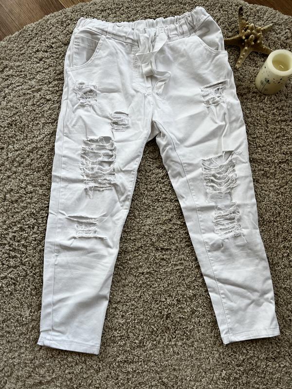 Белые брюки в хорошем состоянии, длина 84,бедра 53+точка тянутся