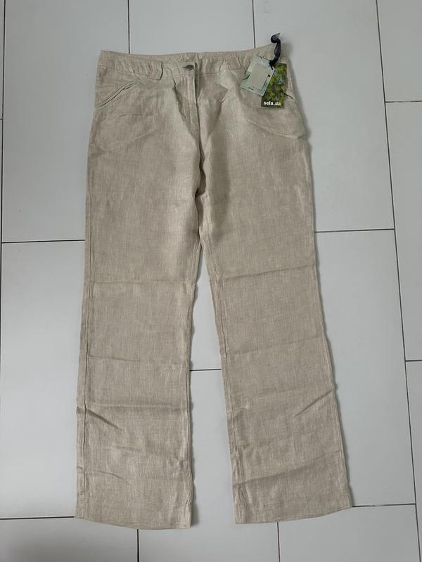 Хорошего качества, длина 110см, длина по внутреннему шву 83см, ширина в талии 44см, в бёдрах 56см, , состав 35% лёна, 65%хлопка