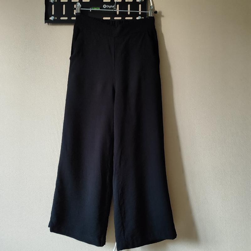 Новые брюки-кюлоты(бирки нет). Талия сзади на широкой резинке.Е карманы.Пот-34(до39),Пос-52,посадка высокая-37.Длина-90.Шерина брючины внизу-28,5