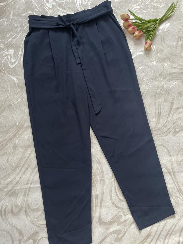 Брюки темно синие с карманами и поясом, позади резинка К низу немножко заужены Можно носить свободно на р.М Так и по фигуре на Л-ХЛ Р.16 Поб 60, посадка 33-36 Пояс 42–44 В носке не были,стан новых Тканина гладенька,легка Длина 104 Ширина штанки снизу 18