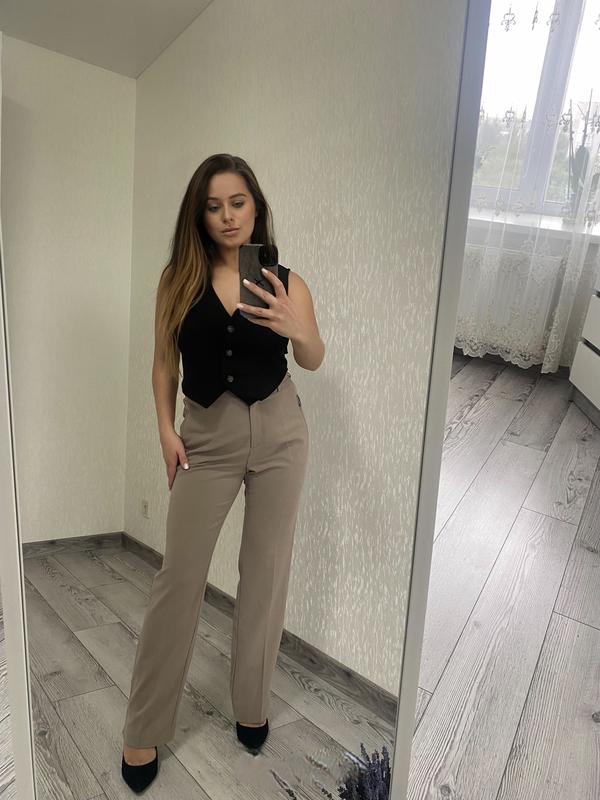 Класичні брюки , прямі , зверху є резинка тому гарно облягає талію , тканина тягнеться , гарно облягає.
