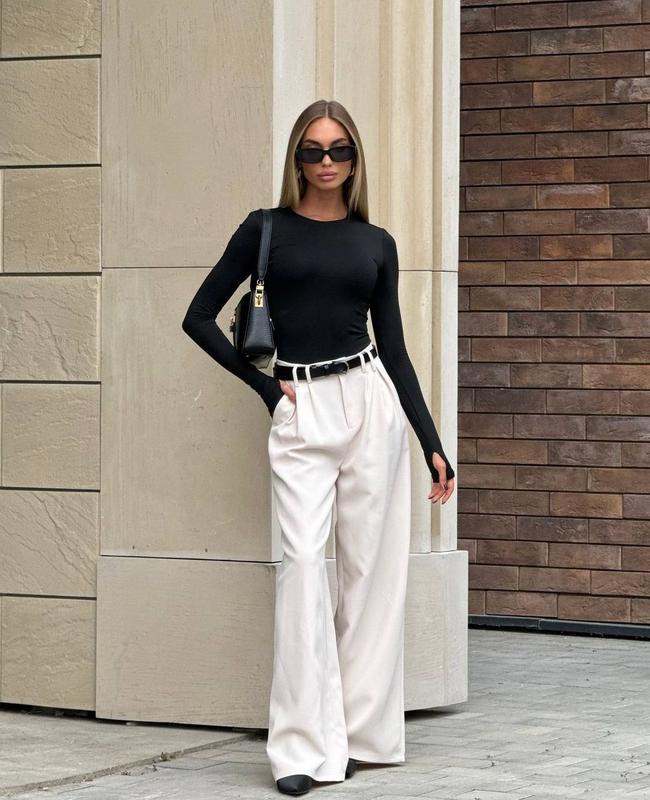 Арт 361-4959 NEW брюки ▪️тканина : костюмка ▪️цвет: молоко ▪️размеры: SM / ML Брюки палаццо; Высокая посадка, с карманами; Длина брюк 110 см Размеры SM <unk> ML Талия: 60-66см <unk> 65-73 см Стегна : 88-94 см | 95-99 см