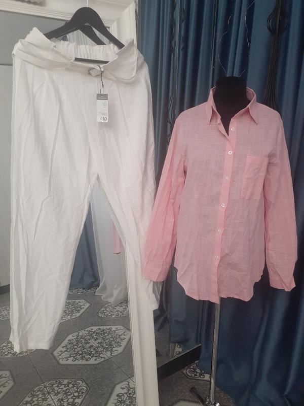 Качество отличное. Тканина прекрасна. Состав нити натуральный, Легкие, прямо воздушные. Очень удобные. Современная модель. К низу зауженные, но на ноге свободные. Новые. Есть фирменная бирка. Размер M Ширина в талии Длина Ширина штанки внизу Комплектом к брюкам является котоновая розовая рубашка. Тоже натуральное.