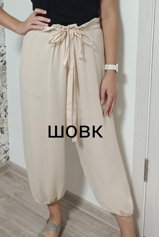 Шелковые брюки в стиле бохо от дорогого бренда. Пояс регулируется двойным шнурком. Боковые карманы, внизу калоши присборенные.