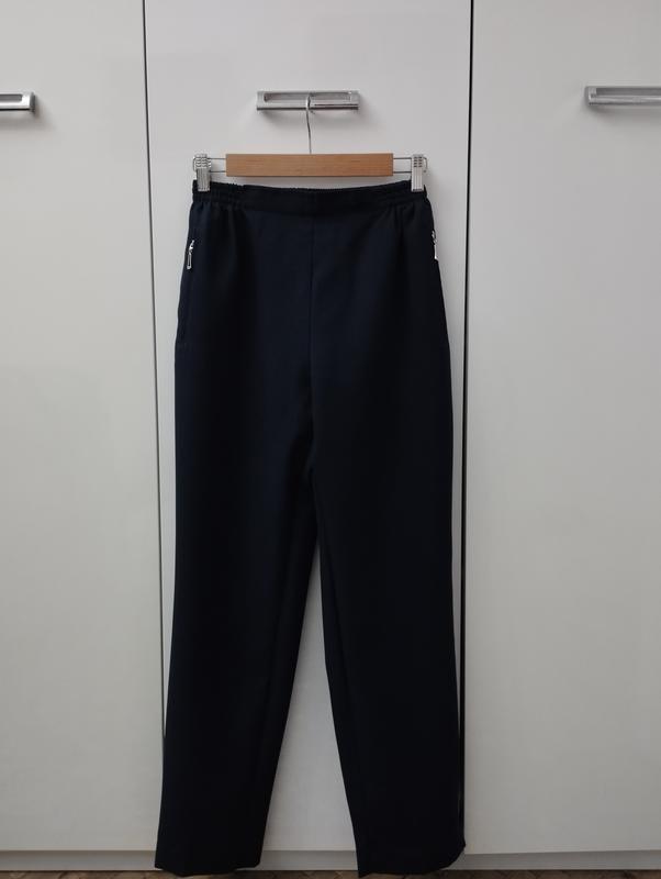 Брюки темно синего цвета, карманы на замочке, талия на резинке, на штанинах внизу есть разрезы. Ориентируйтесь на замеры. ПТ 30, тянется до 43 ПБ до 52 Длина 97 Крок 70 Посадка спереди 30 Аосадка сзади 39 Ширина штанины снизу 17.5