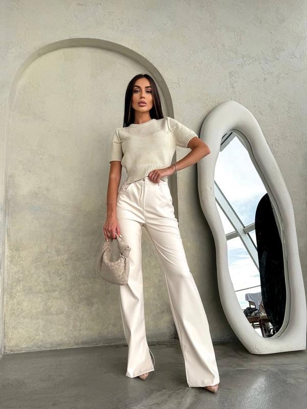 Штани арт. cb. 1162 Ткань: эко кожа на замше Размеры: 42-44 и 44-46 Цвета: черный и молочный Кожаные брюки с идеальной посадкой и вырезами. Очень стильные и эффектные. Ткань очень качественная, мягкая и приятная к телу.