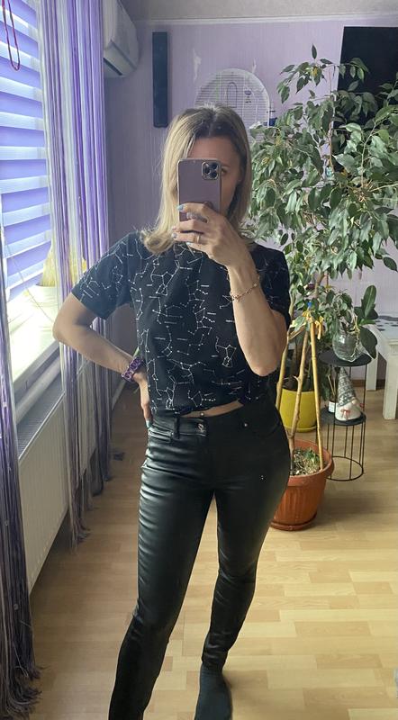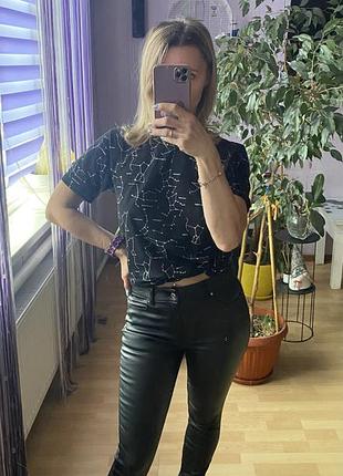 Красивые брюки, которые подчеркнут вашу фигуру, идут на размер С-М, на вид материал напоминает эко кожу, красиво тянутся.