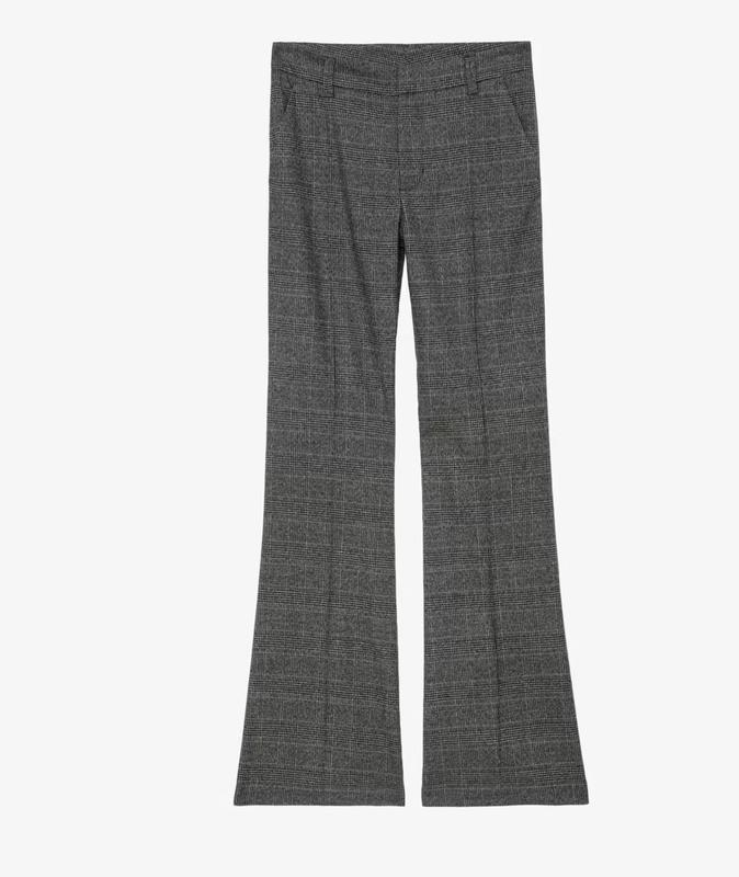 Женские антрацитовые брюки - Низкая талия - Напечатано в чеках - Застежка-молния с крючком и петлями для ремня на талии - 2 боковых кармана и 2 кармана с трубкой сзади - Слегка расклешенный низ - Складывается по длине