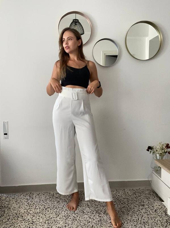 Продам белые брюки, состояние новое. На меня большие, хотя написан размер S, но лучше на М. Талия 1/2 34см Длина 106см Длина внутренняя 69см